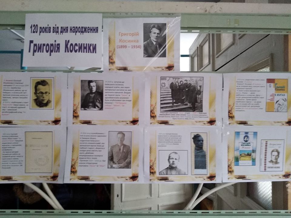 Бліняєва Ю. І., бібліотекар школи, створює експозиції, присвячені долям людей, яких, на її думку, повинні знати діти. Черговим героєм став Григорій Косинка-український письменник-новеліст. Людина, яка йшла на вірну смерть, лаючись і відбиваючись від конвоїрів. Він сміливо міг сказати правду в очі в ті страшні часи, коли всі жили в страху й терорі. Ця людина- справжній українець, який хотів бачити свій народ вільним й щасливим.